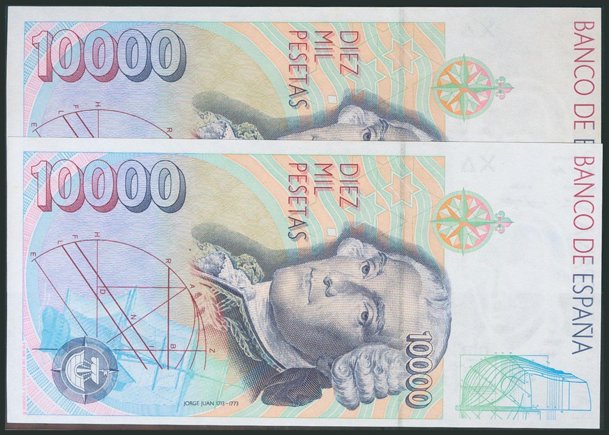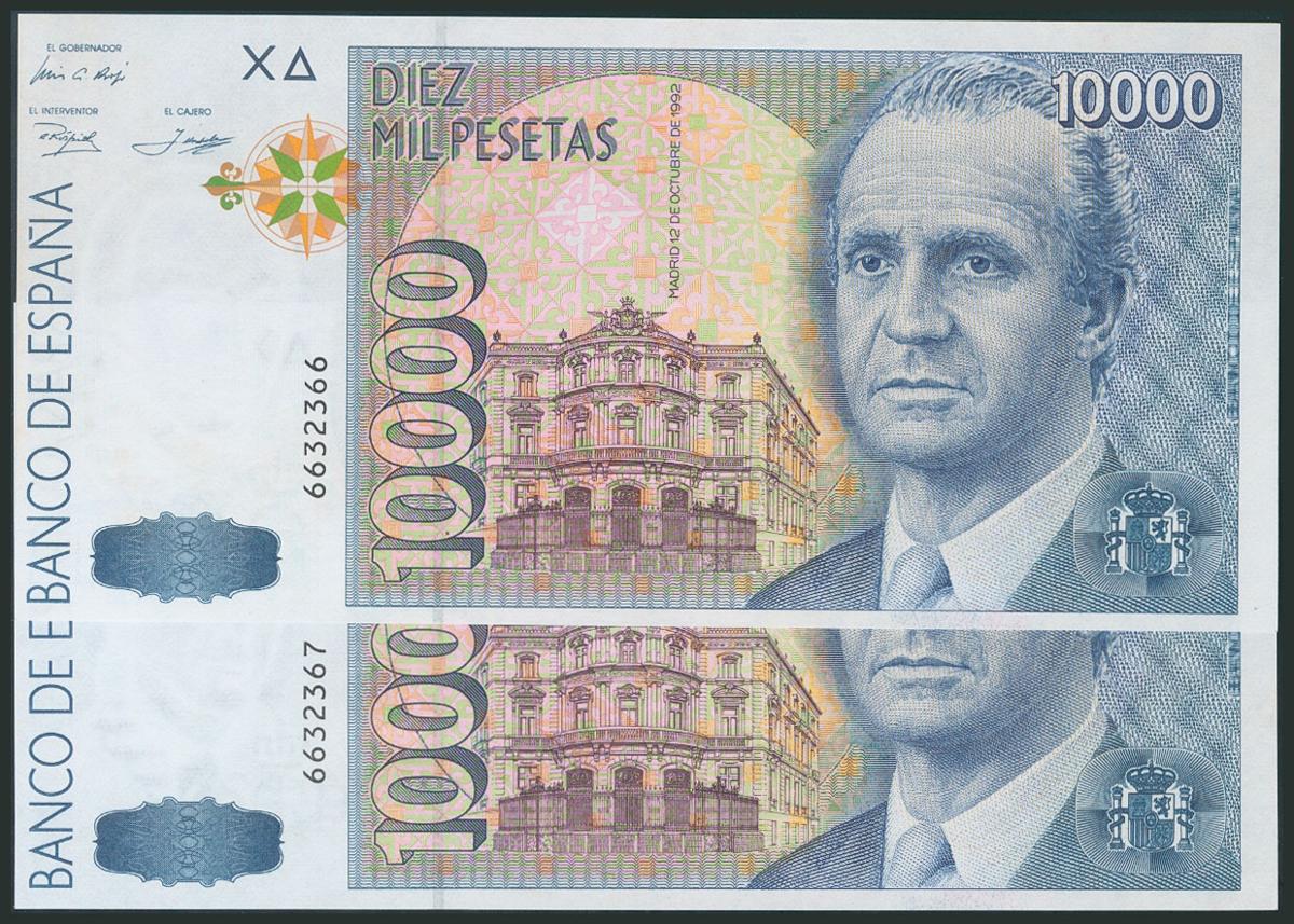 10000 Pesetas. 12 de Octubre de 1992. Pareja correlativa. Sin serie, uno de ellos numeración capicúa. (Edifil 2017: 485). SC.