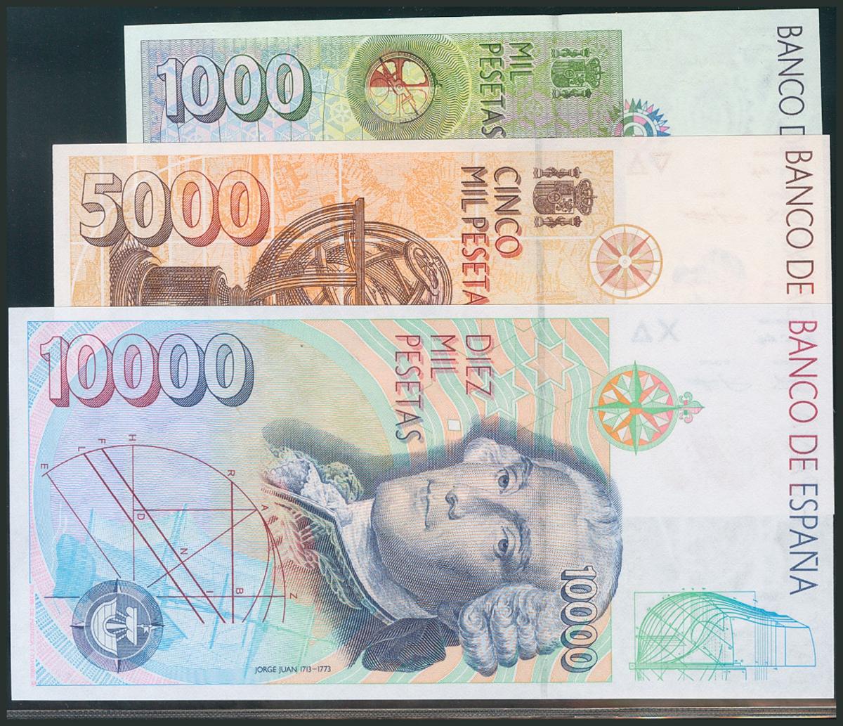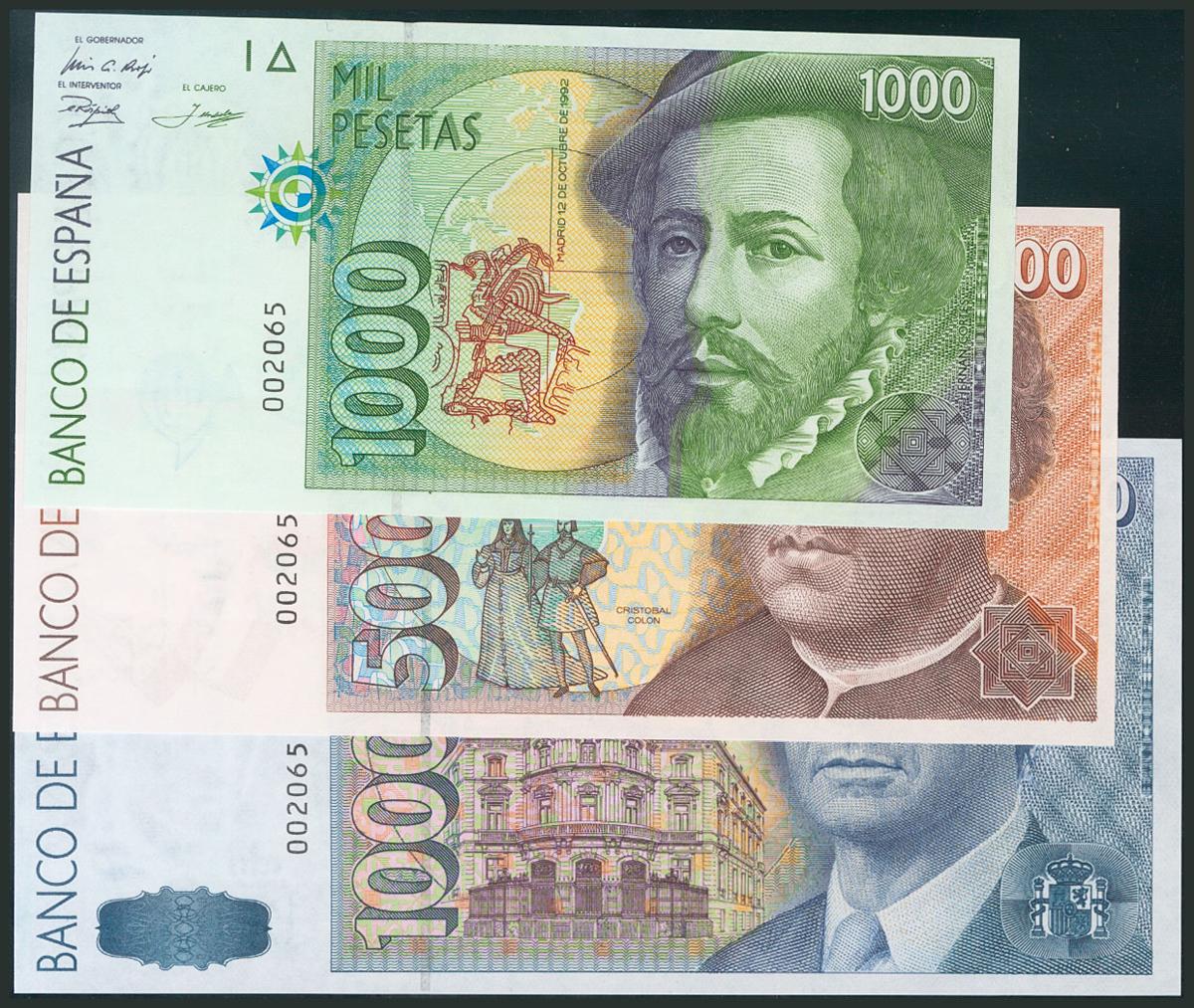 Conjunto de 3 billetes del Banco de España de 1000 Pesetas, 5000 Pesetas y 10000 Pesetas, emitidos todos en 1992, sin serie y con la misma numeración baja 2065. (Edifil 2017: 483, 484, 485). SC.