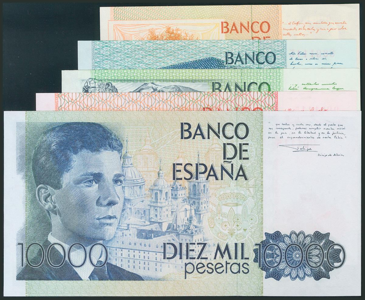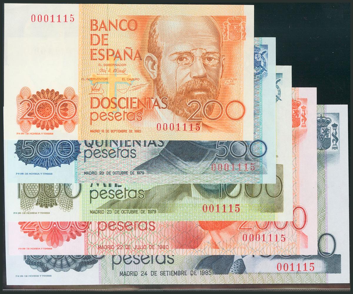 Conjunto de 5 billetes del Banco de España de 200 Pesetas, 500 Pesetas, 1000 Pesetas, 2000 Pesetas y 10000 Pesetas, todos los billetes emitidos entre 1979 y 1985 (a excepción del de 5000 Pesetas, que precisamente el catálogo Edifil no lo incorpora como serie completa), todos sin serie y con la misma numeración baja 0001115. (Edifil 2017: 480, 476, 477, 479, 481). SC.