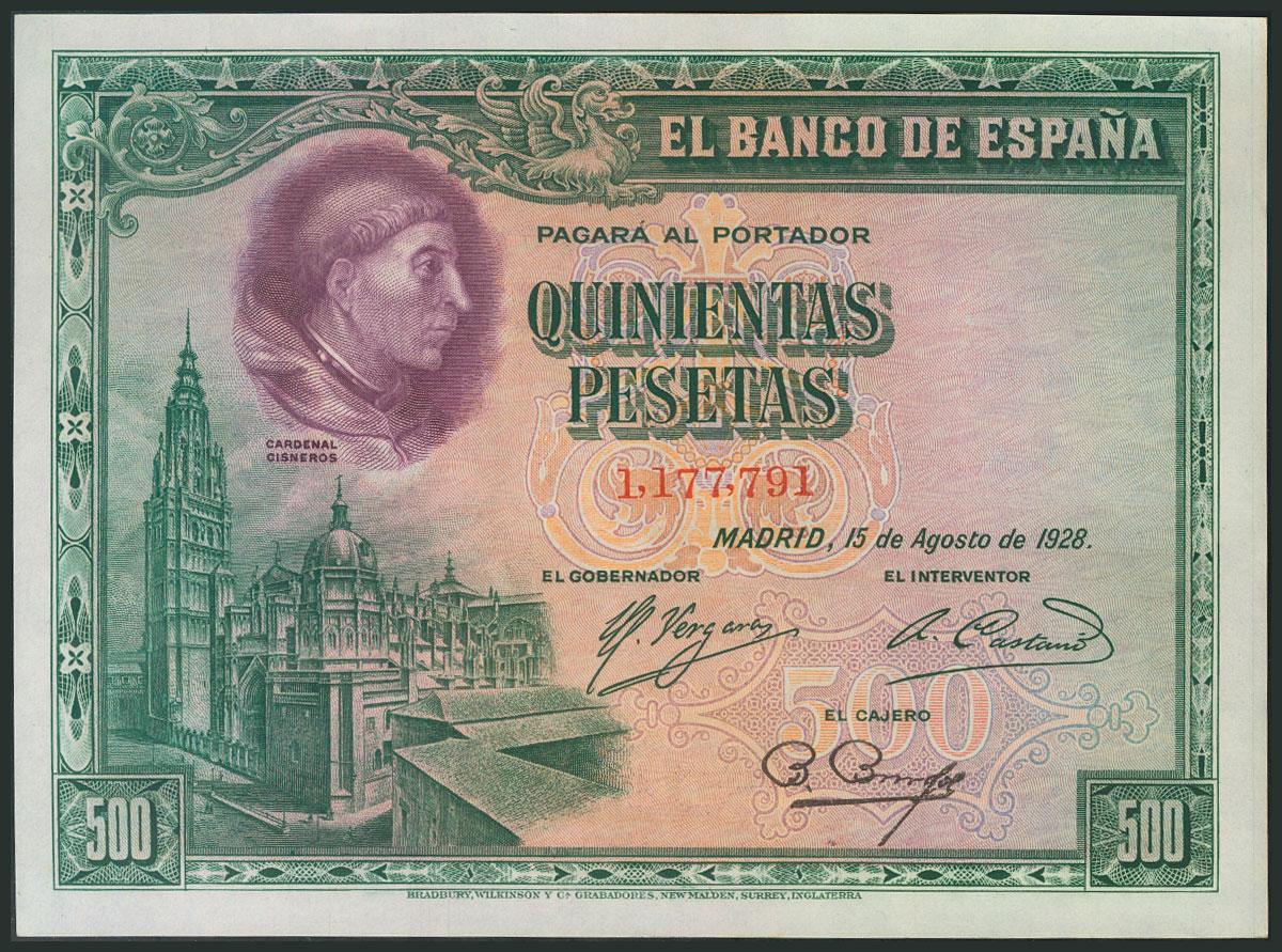 500 Pesetas. 15 de Agosto de 1928. Sin serie. (Edifil 2017: 356). Conserva todo su apresto original. SC.