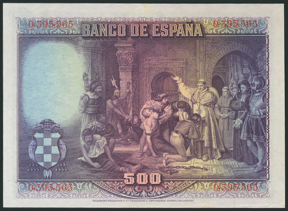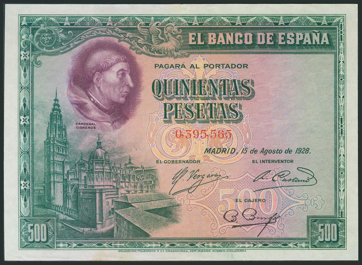500 Pesetas. 13 de Agosto de 1928. Sin serie. (Edifil 2017: 356). Apresto original, pequeña rotura en el margen inferior. MBC+.