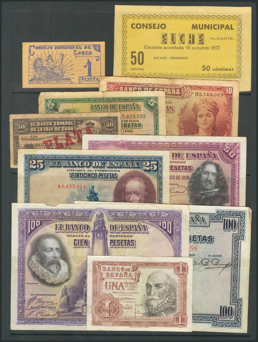 Conjunto de 10 billetes del Banco de España y de la Guerra Civil, en diversas calidades. A EXAMINAR.