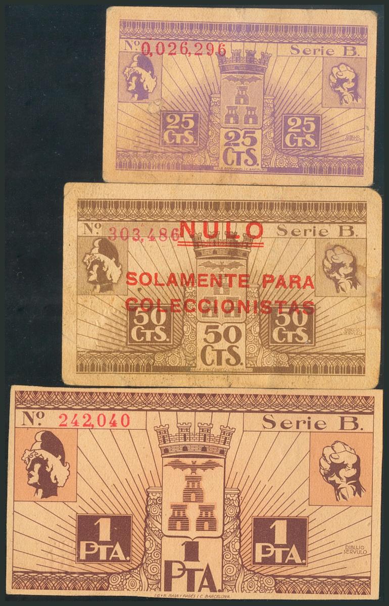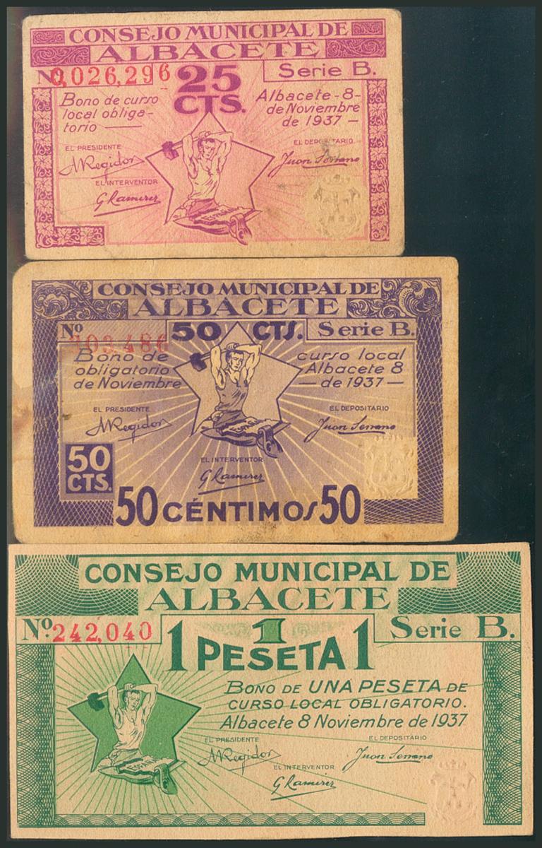 ALBACETE. 25 Céntimos, 50 Céntimos y 1 Peseta. 8 de Noviembre de 1937. Serie B. (González: 130/32). El billete de 50 cts con inscripción "sólo para coleccionistas". EBC-.