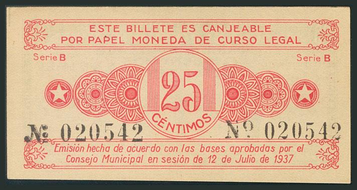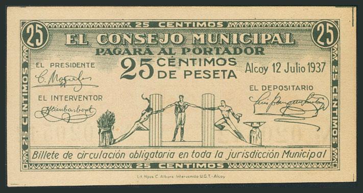 ALCOY (ALICANTE). 25 Céntimos. 12 de Julio de 1937. (González: 378). EBC+.