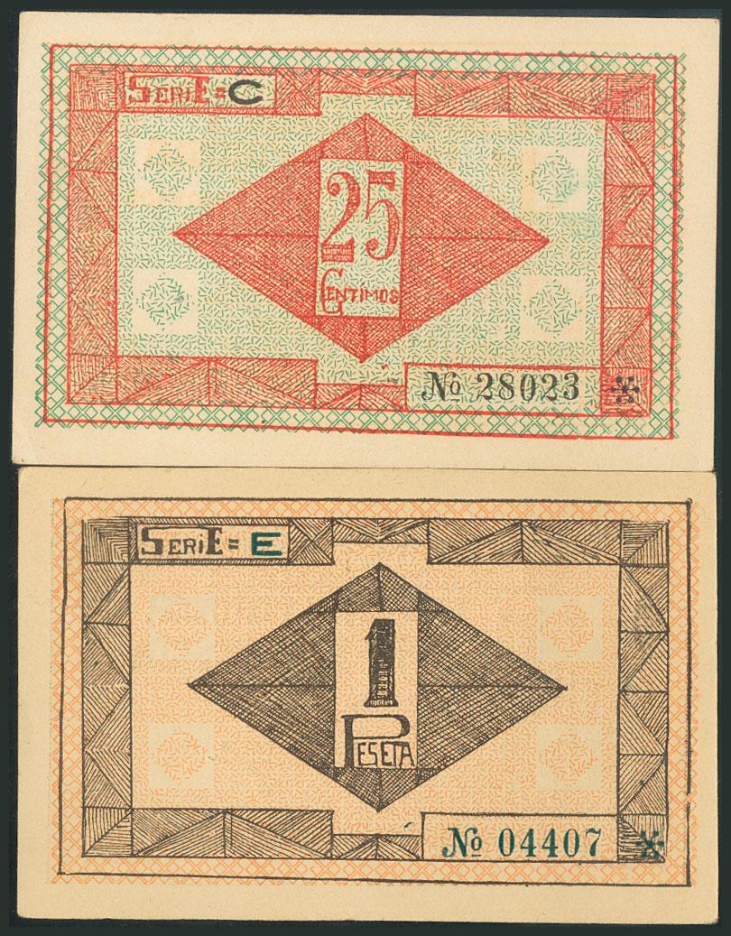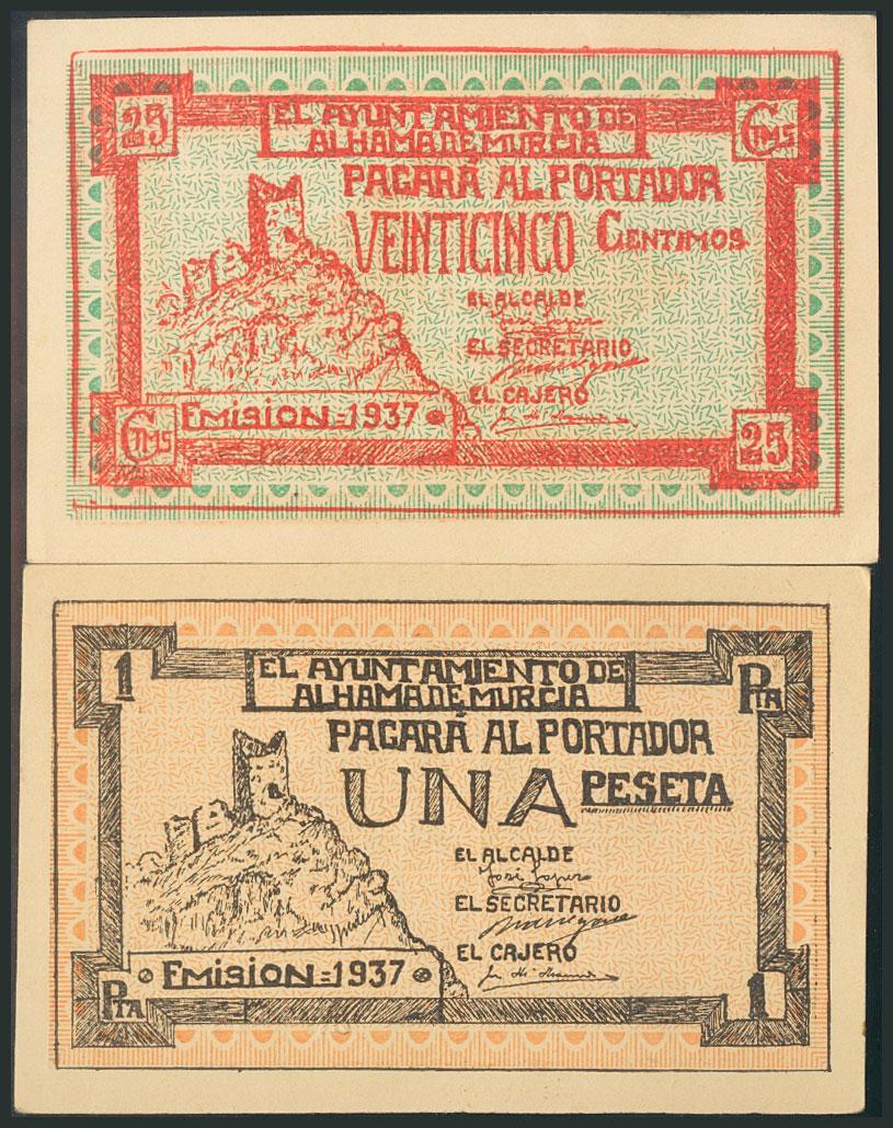 ALHAMA DE MURCIA (MURCIA). 25 Céntimos y 1 Peseta. 1937. Serie C y E, respectivamente. (González: 495, 496). Inusuales. SC.