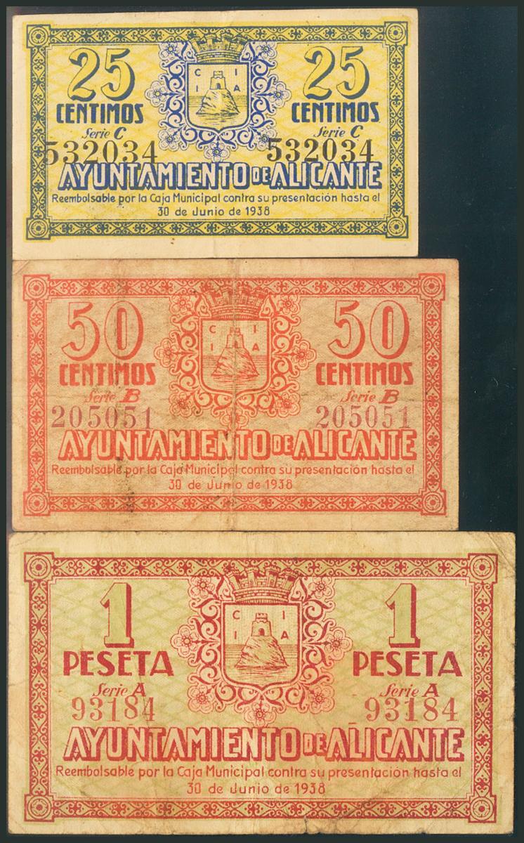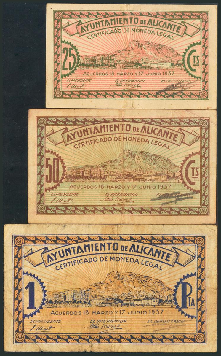 ALICANTE. 25 Céntimos, 50 Céntimos y 1 Peseta. 17 de Junio de 1937. Series C, B y A, respectivamente. (González: 508, 509, 510). MBC.