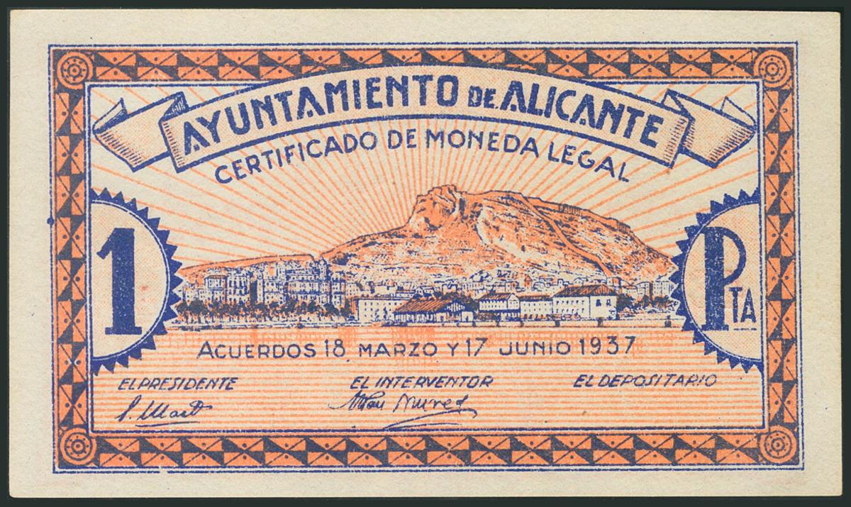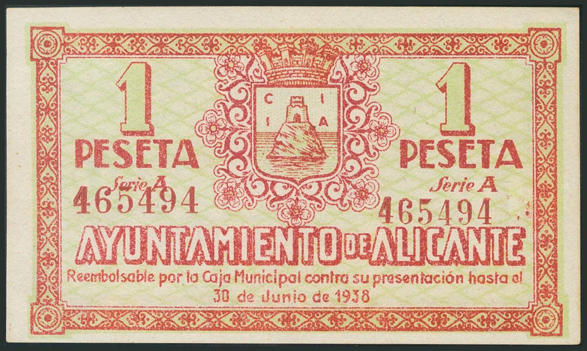 ALICANTE. 1 Peseta. 30 de Junio de 1937. Serie A. (González: 510). EBC+.