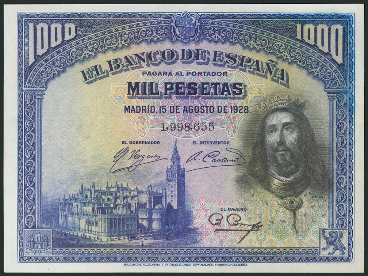 1000 Pesetas. 15 de Agosto de 1928. Sin serie. (Edifil 2017: 357). SC.