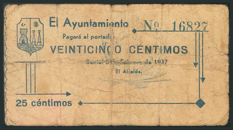 BENIEL (MURCIA). 25 Céntimos. 8 de Febrero de 1937. (González: 1096). Raro. RC.