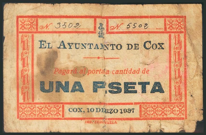 COX (ALICANTE). 1 Peseta. 10 de Marzo de 1937. (González: 2077). Muy raro, billete cosido. BC.