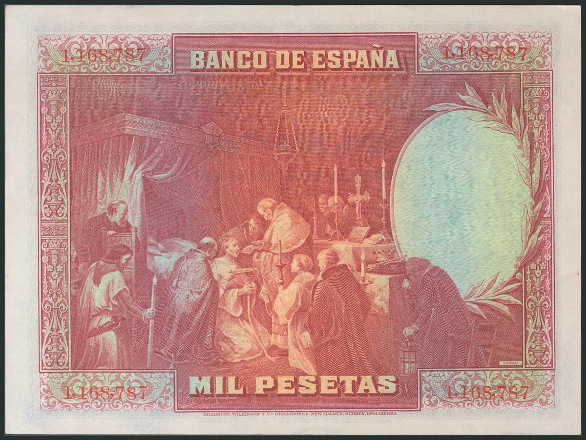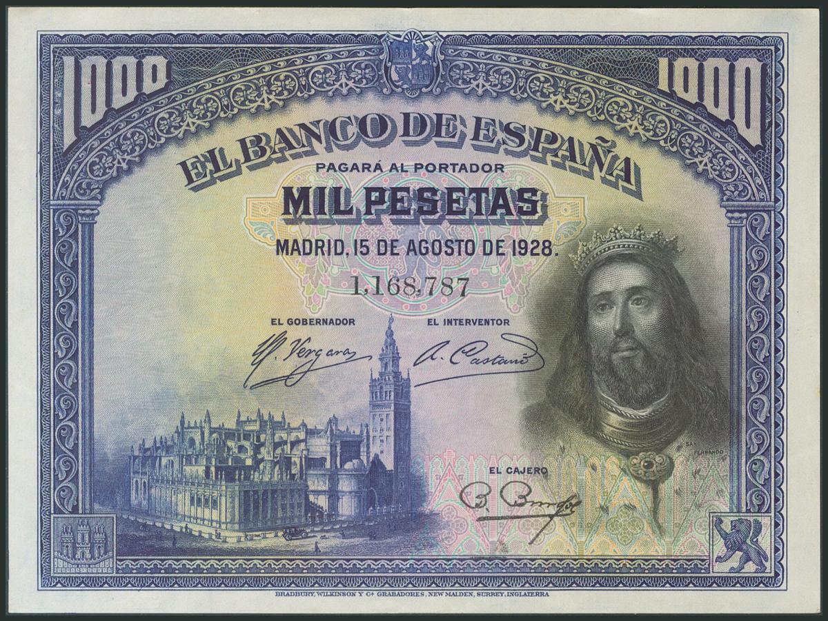 1000 Pesetas. 15 de Agosto de 1928. Sin serie. (Edifil 2017: 357). El doblez central apenas rompe la fibra, conservando gran parte del apresto original. EBC.