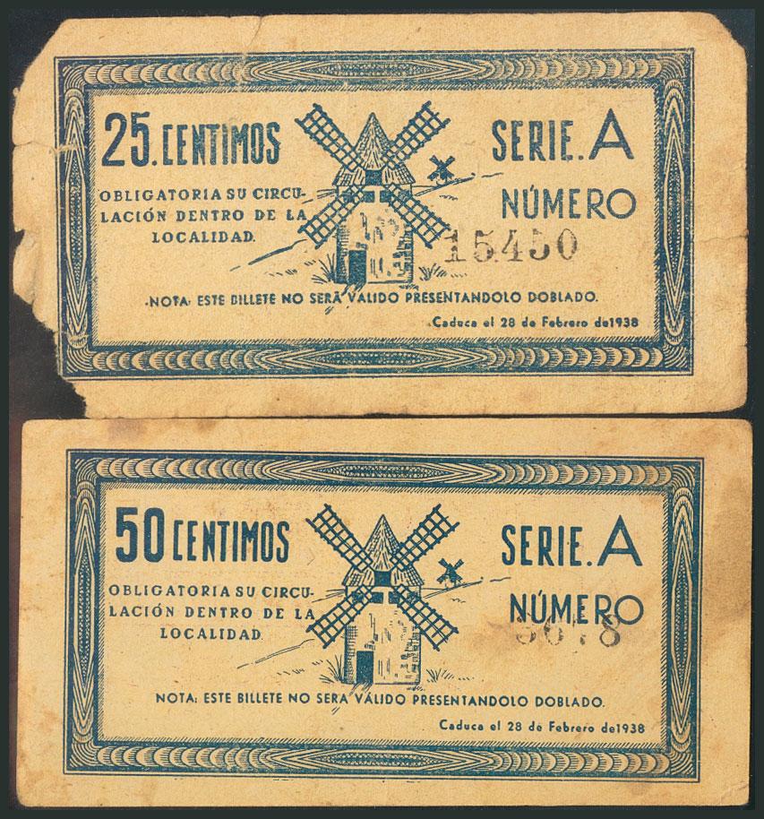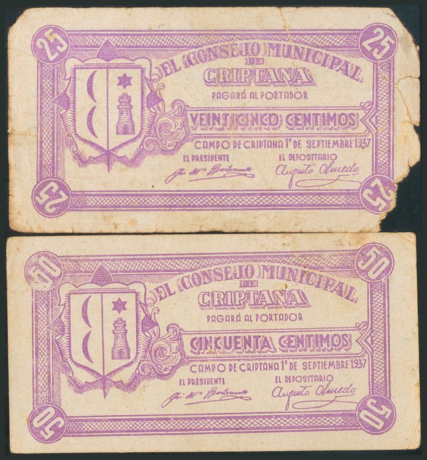 CRIPTANA (CIUDAD REAL). 25 Céntimos y 50 Céntimos. 1 de Septiembre de 1937. Serie A, ambos. (González: 2099, 2100). RC.