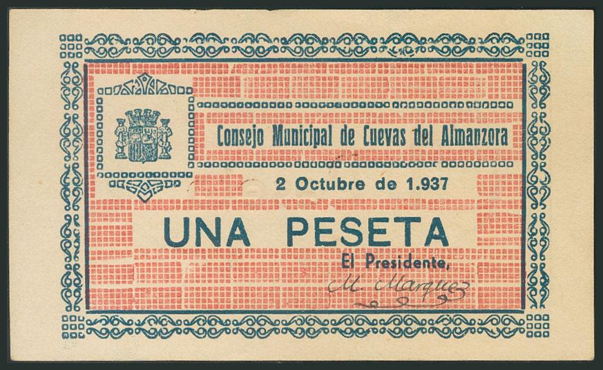 CUEVAS DEL ALMANZORA (ALMERIA). 1 Peseta. 2 de Junio de 1937. (González: 2142). EBC.
