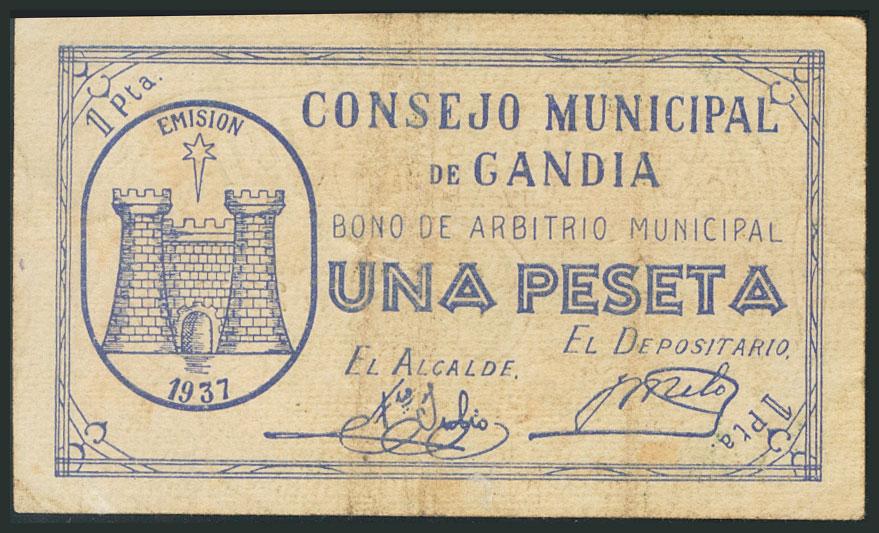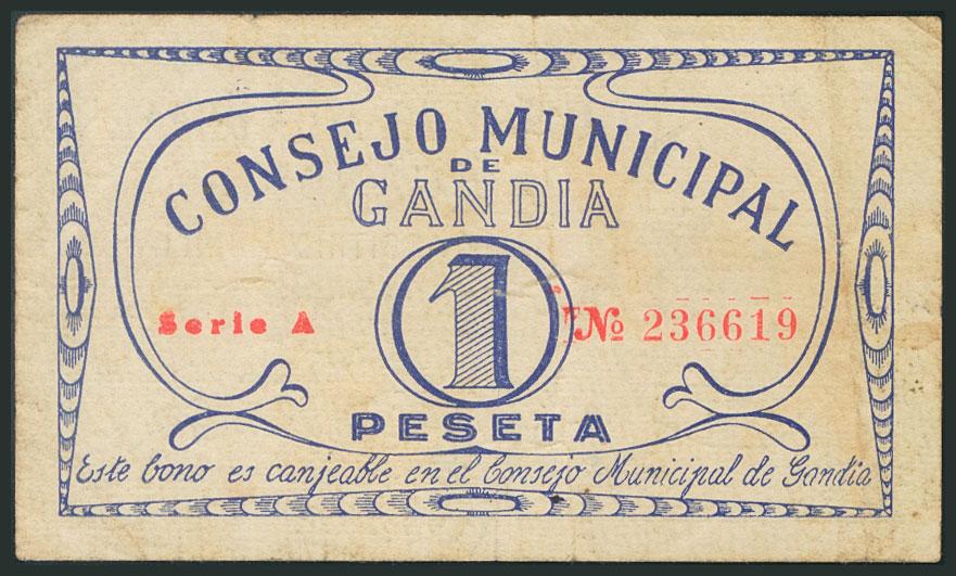 GANDIA (VALENCIA). 1 Peseta. 1937. Serie A. (González: 2611). MBC+.