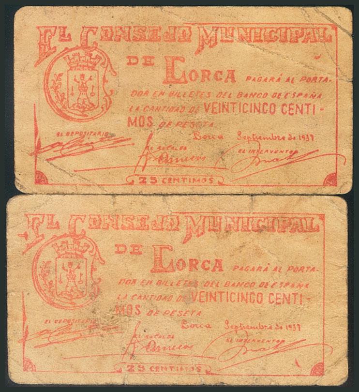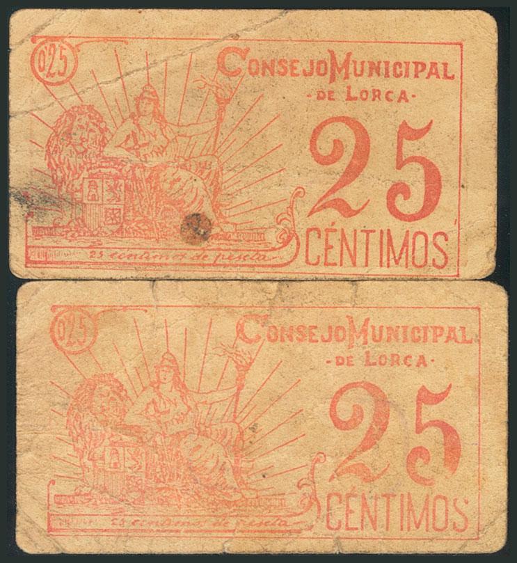 LORCA (MURCIA). 25 Céntimos (2). Septiembre 1937. (González: 3231). BC.