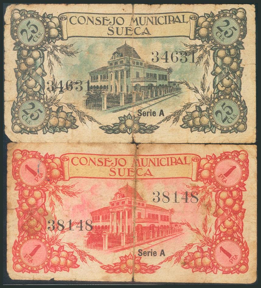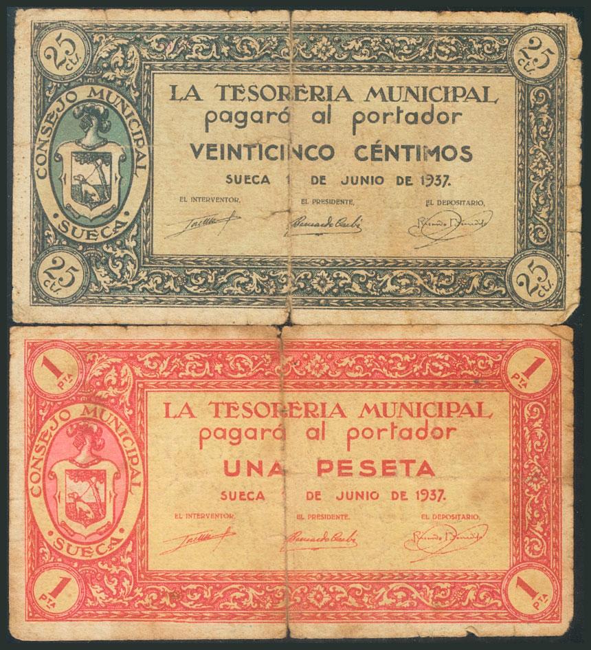SUECA (VALENCIA). 25 Céntimos y 1 Peseta. 1 de Junio de 1937. Serie A, ambos. (González: 4929, 4930). MBC.