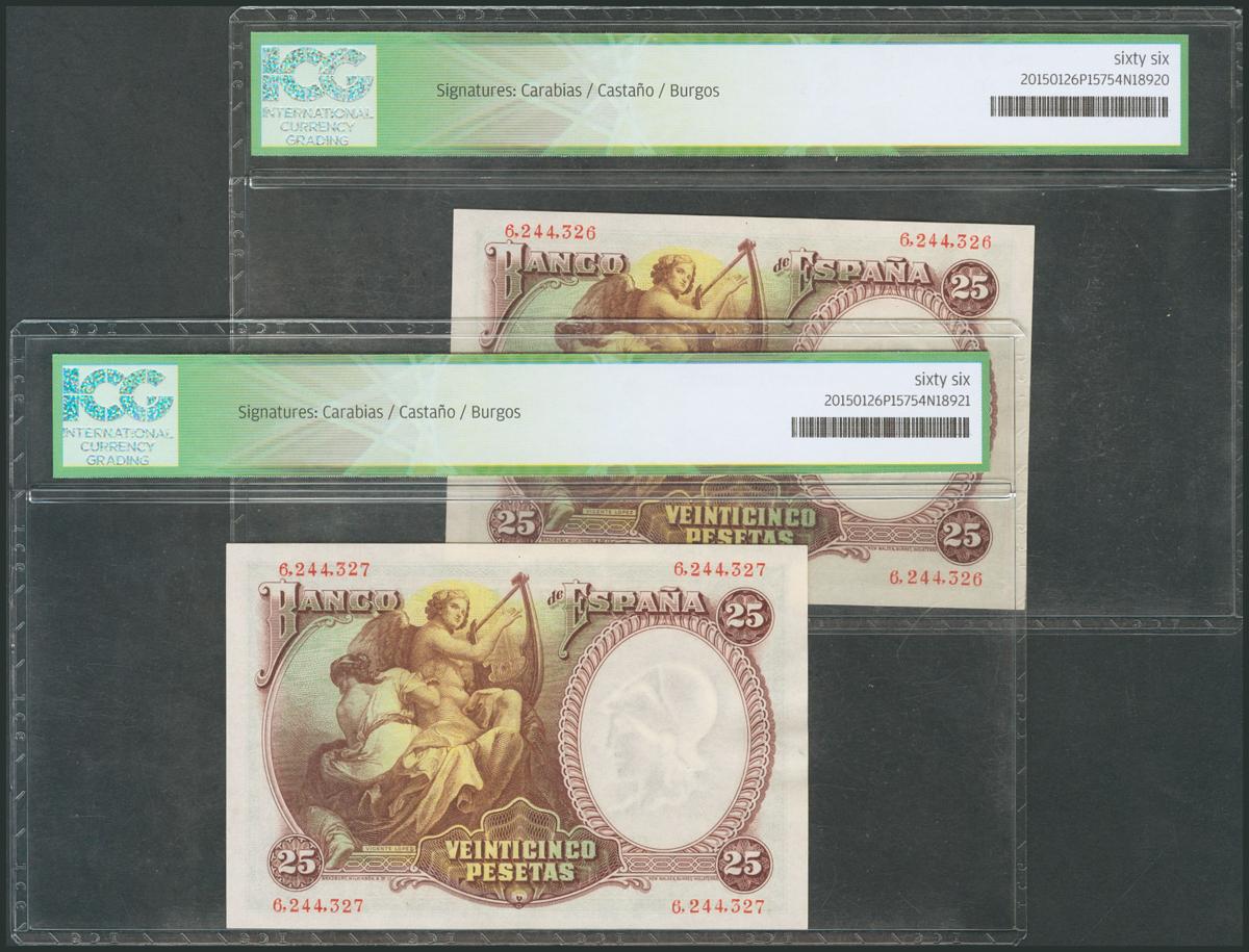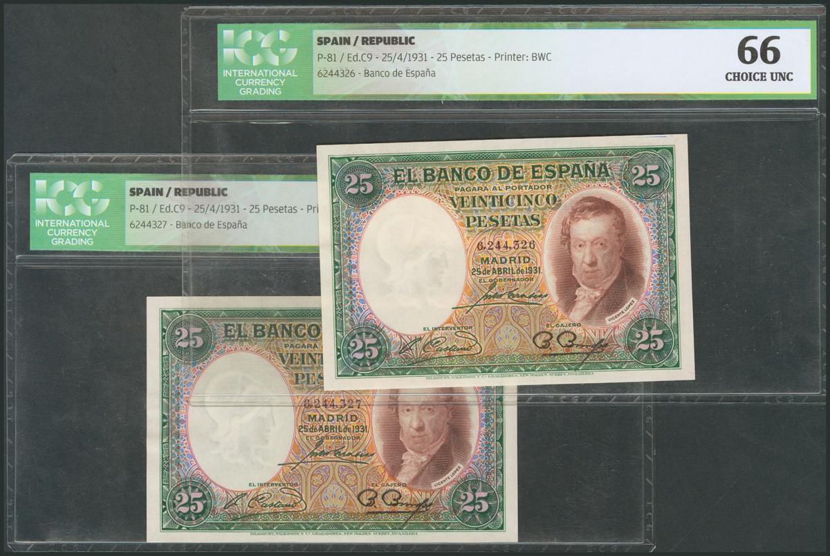 25 Pesetas. 25 de Abril de 1931. Pareja correlativa. Sin serie. (Edifil 2017: 358). Encapsulado ICG66, ambos. SC.