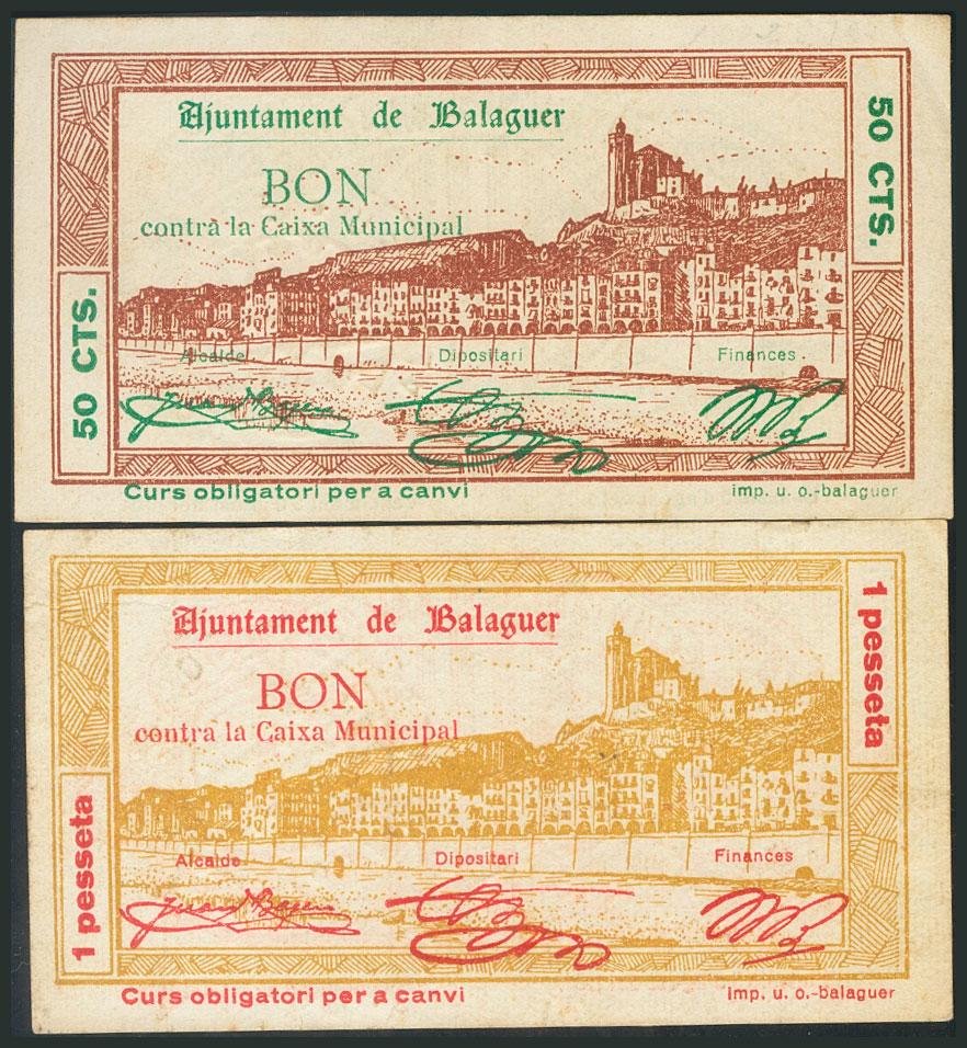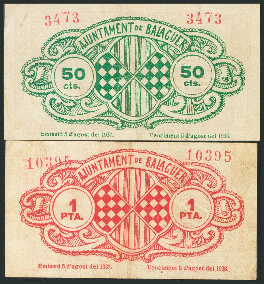 BALAGUER (LERIDA). 50 Céntimos y 1 Peseta. 5 de Agosto de 1937. (González: 6487/88). MBC.