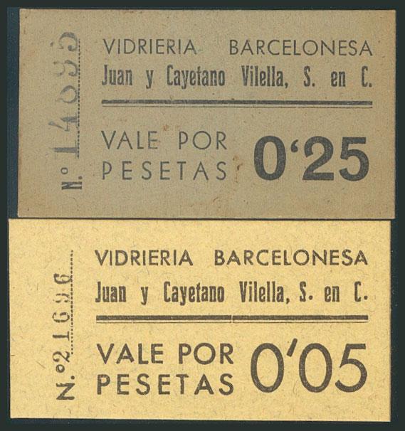BARCELONA. Serie completa de 5 Céntimos y 25 Céntimos. (1938ca). Vidriera Barcelonesa Juan y Cayetano Vilella. (González: 6890/91). EBC/MBC.