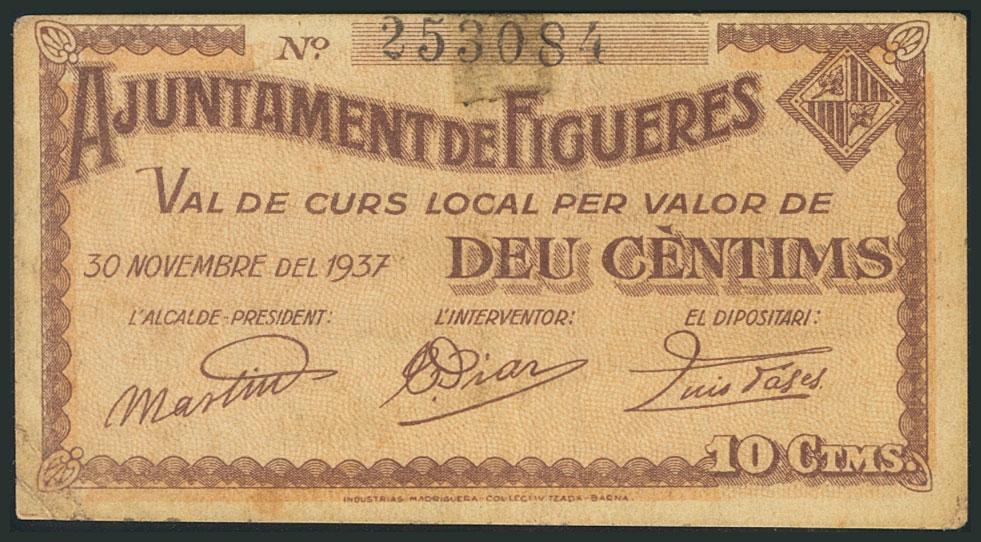 FIGUERES (GERONA). 10 Céntimos. 30 de Noviembre de 1937. (González: 7852). MBC.