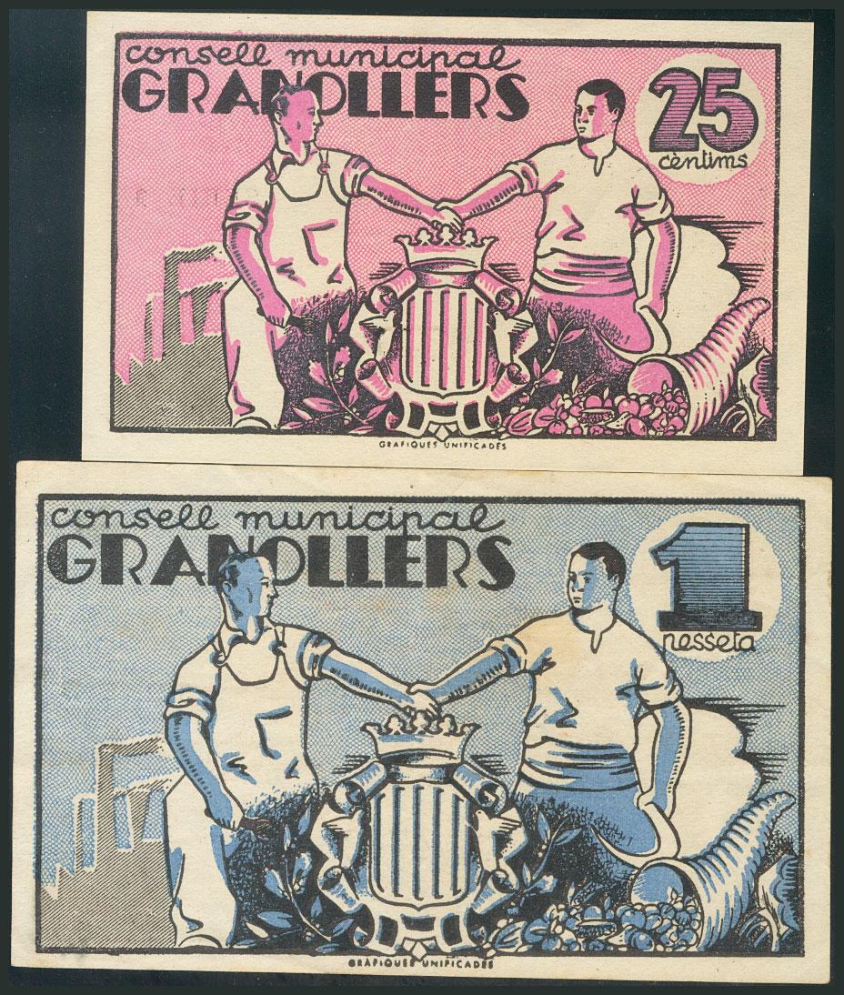 GRANOLLERS (BARCELONA). 25 Céntimos y 1 Peseta. 1 de Junio de 1937. Series I y B, respectivamente. (González: 8111/12). EBC-.