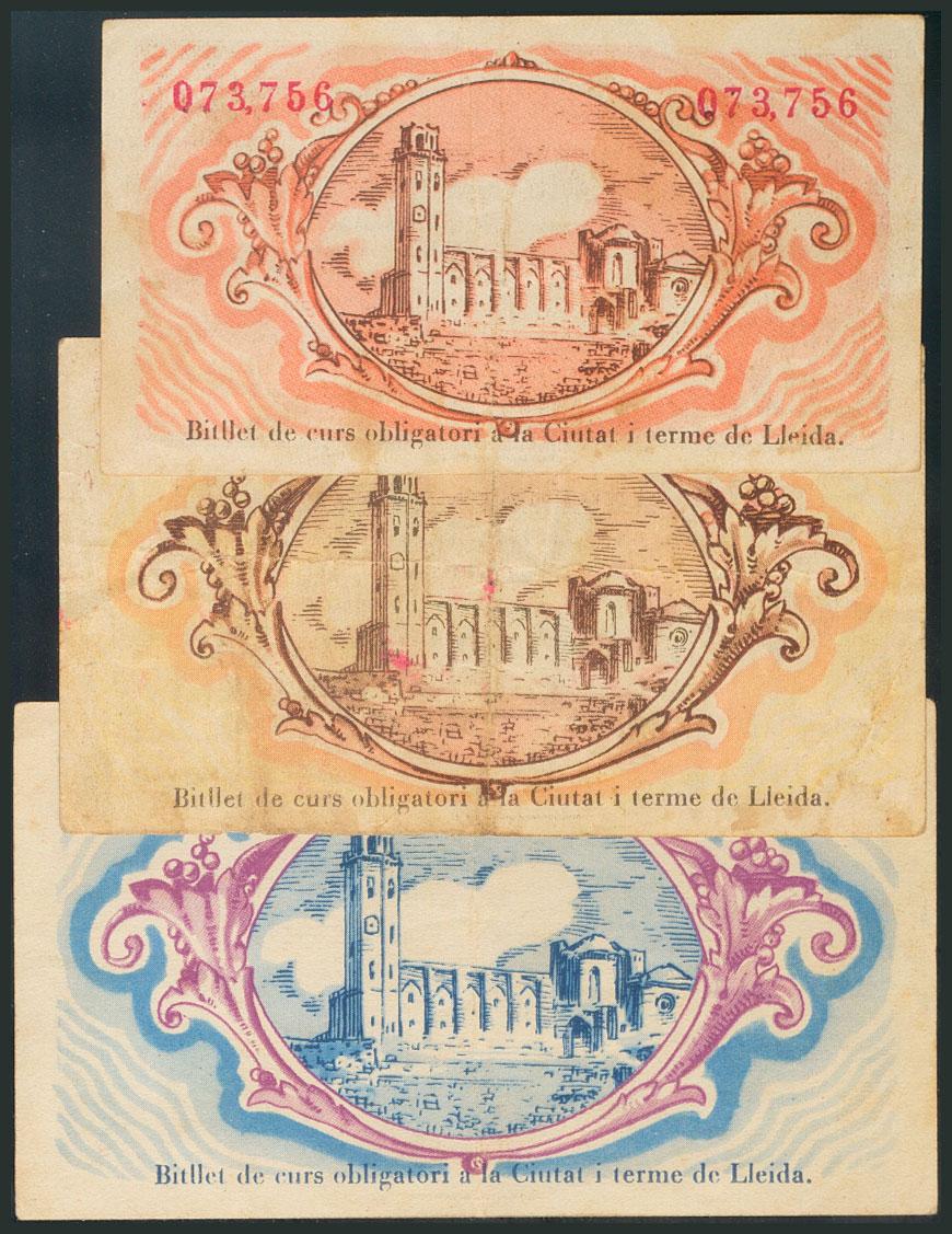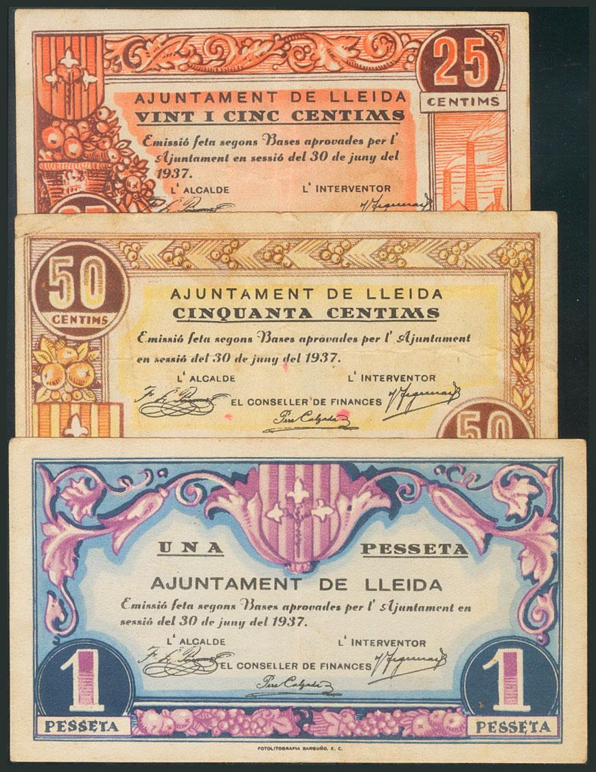 LERIDA. 25 Céntimos, 50 Céntimos y 1 Peseta. 30 de Junio de 1937. (González: 8358/60). EBC.
