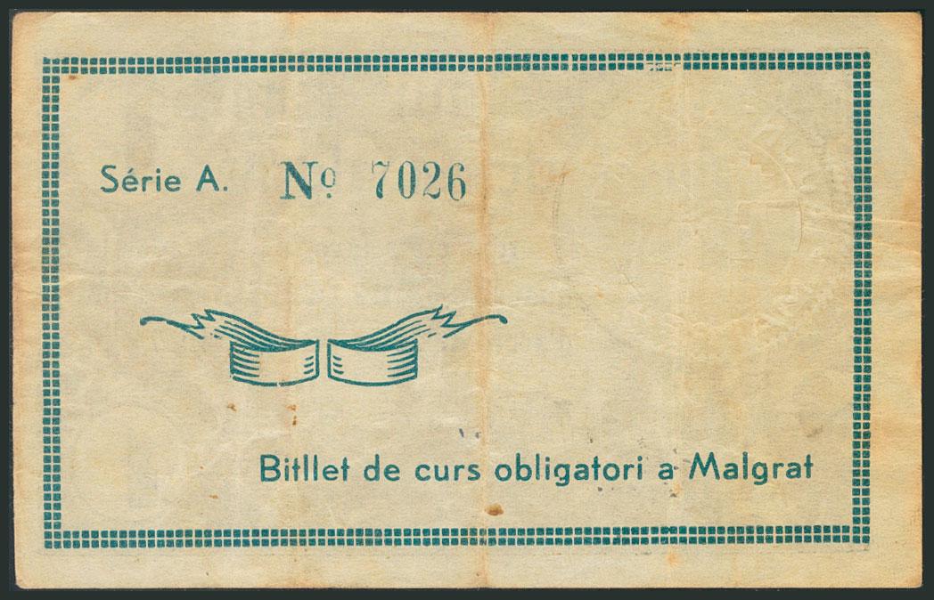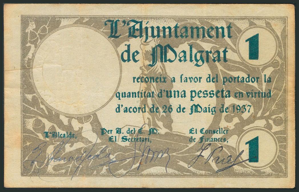 MOLGRAT (BARCELONA). 1 Peseta. 26 de Mayo de 1937. Serie A. (González: 8474). MBC.