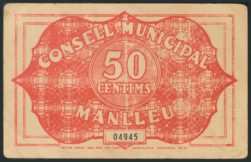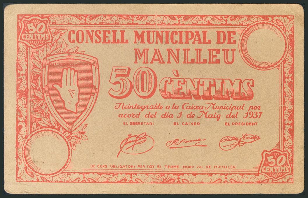 MANLLEU (BARCELONA). 50 Céntimos. 1 de Mayo de 1937. (González: 8489). MBC.