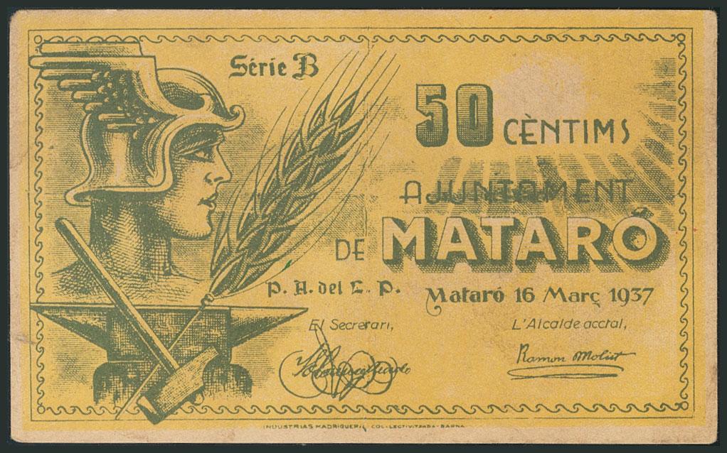 MATARO (BARCELONA). 50 Céntimos. 16 de Marzo de 1937. Serie B. (González: 8658). MBC.