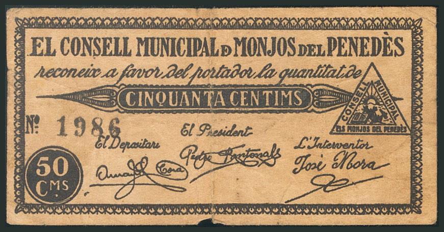 MONJOS DE PENEDES (BARCELONA). 50 Céntimos. (1938ca). (González: 8732). Raro. MBC.