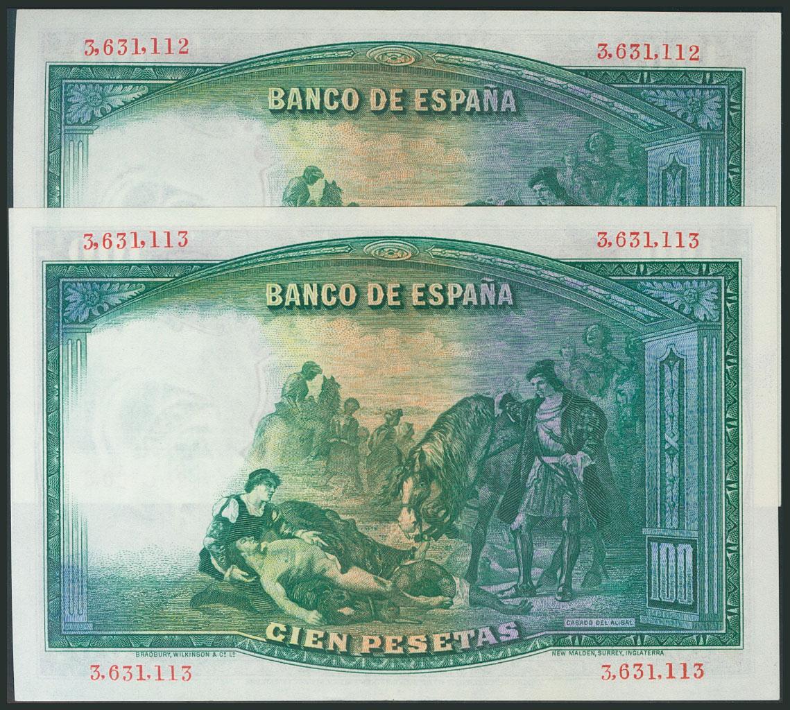 100 Pesetas. 25 de Abril de 1931. Pareja correlativa. Sin serie. (Edifil 2017: 360). Apresto original. EBC+.