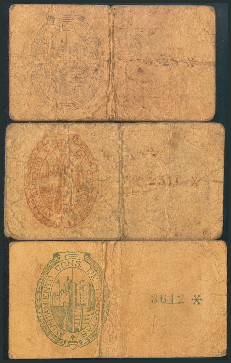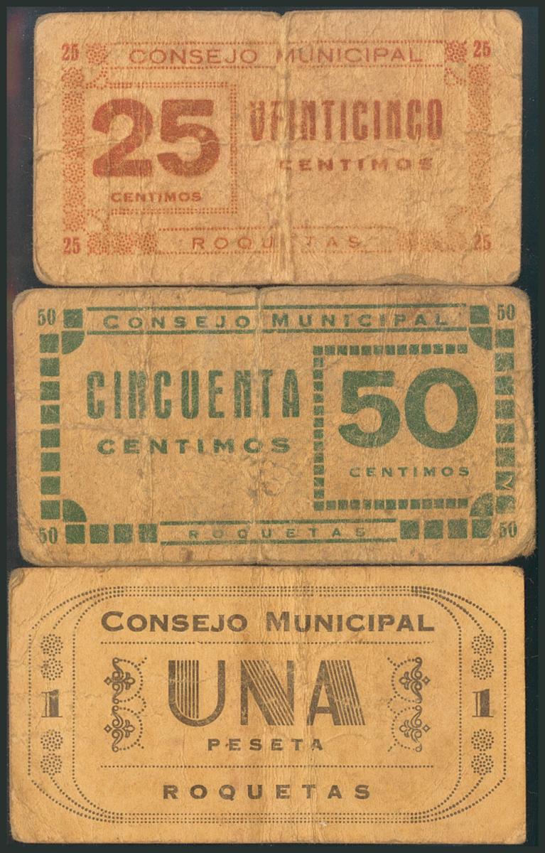 ROQUETAS (TARRAGONA). 25 Céntimos, 50 Céntimos y 1 Peseta. (1938ca). (González: 9730, 9732, 9734). Raros. BC.