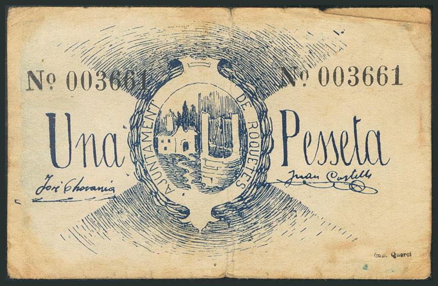 ROQUETES (TARRAGONA). 1 Peseta. (1938ca). (González: 9737). Raro. RC.