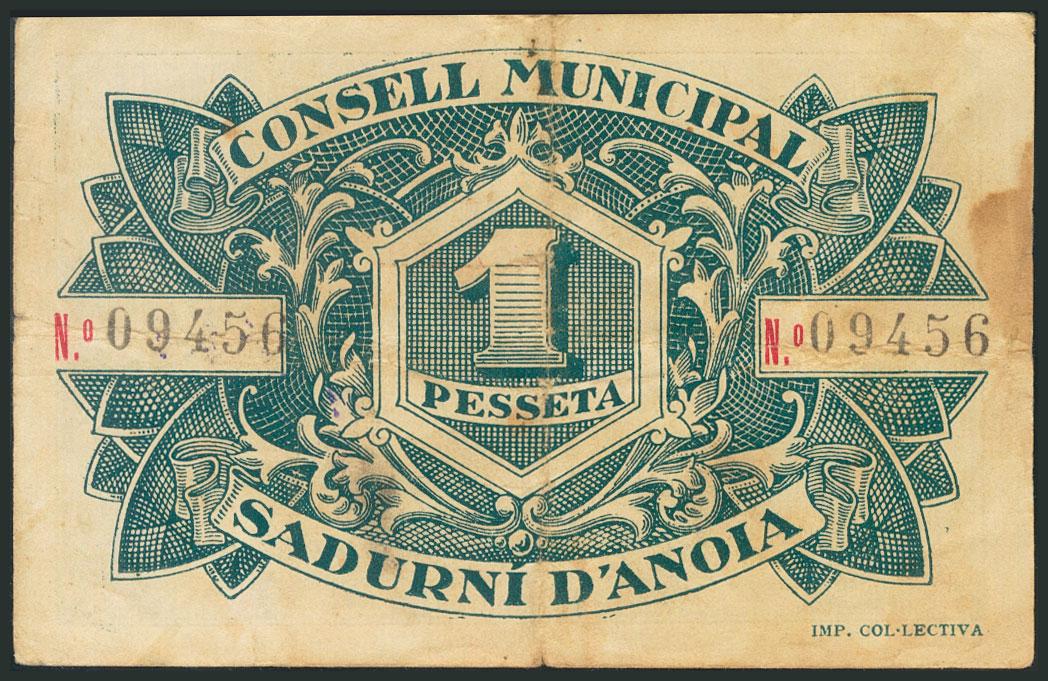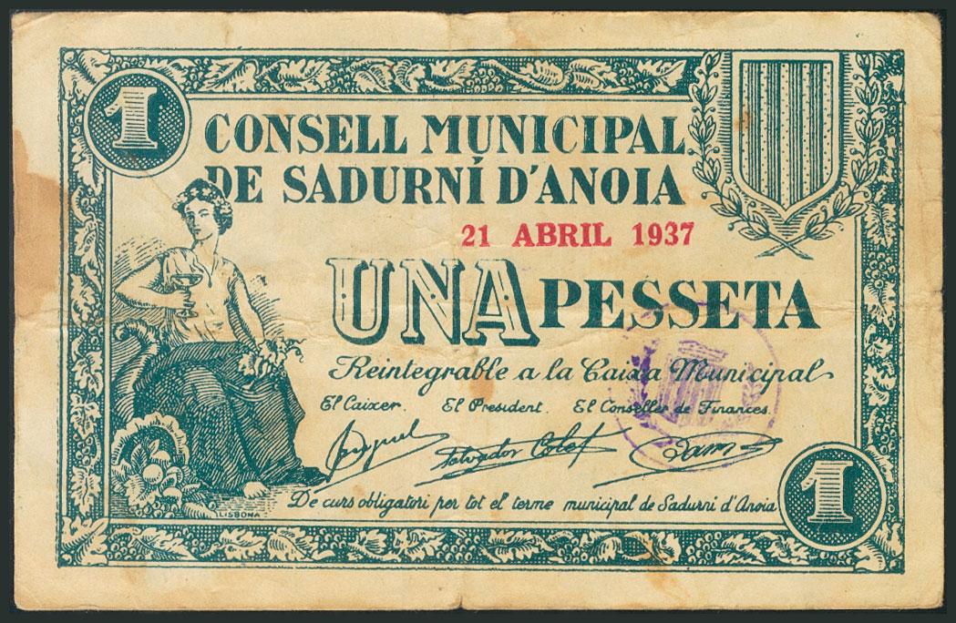 SADURNI D´ANOIA (BARCELONA). 1 Peseta. 21 de Abril de 1937. (González: 9803). MBC.