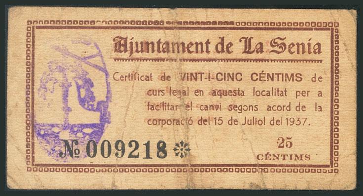 LA SENIA (TARRAGONA). 25 Céntimos. 15 de Junio de 1937. (González: 9940). Inusual. MBC.