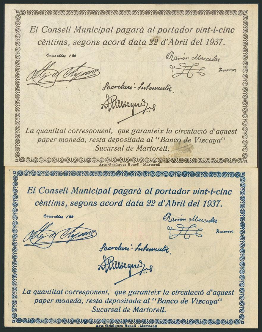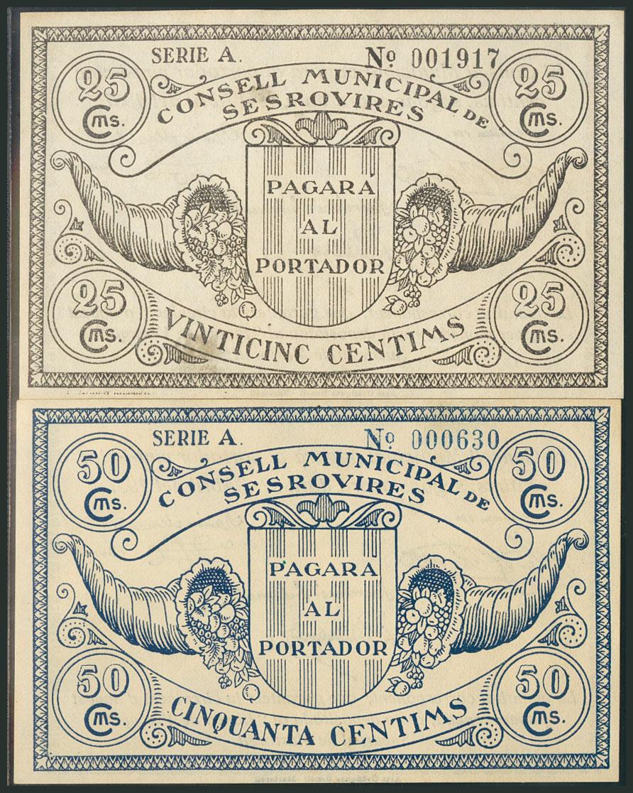 SESROVIRES (BARCELONA). 25 Céntimos y 50 Céntimos. 22 de Abril de 1937. Serie A, ambos. (González: 9993, 9994). Inusuales. SC.