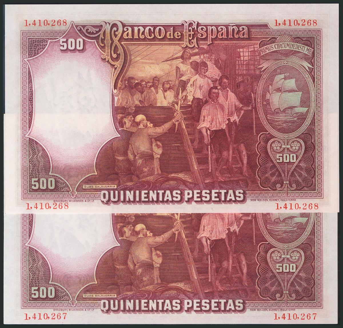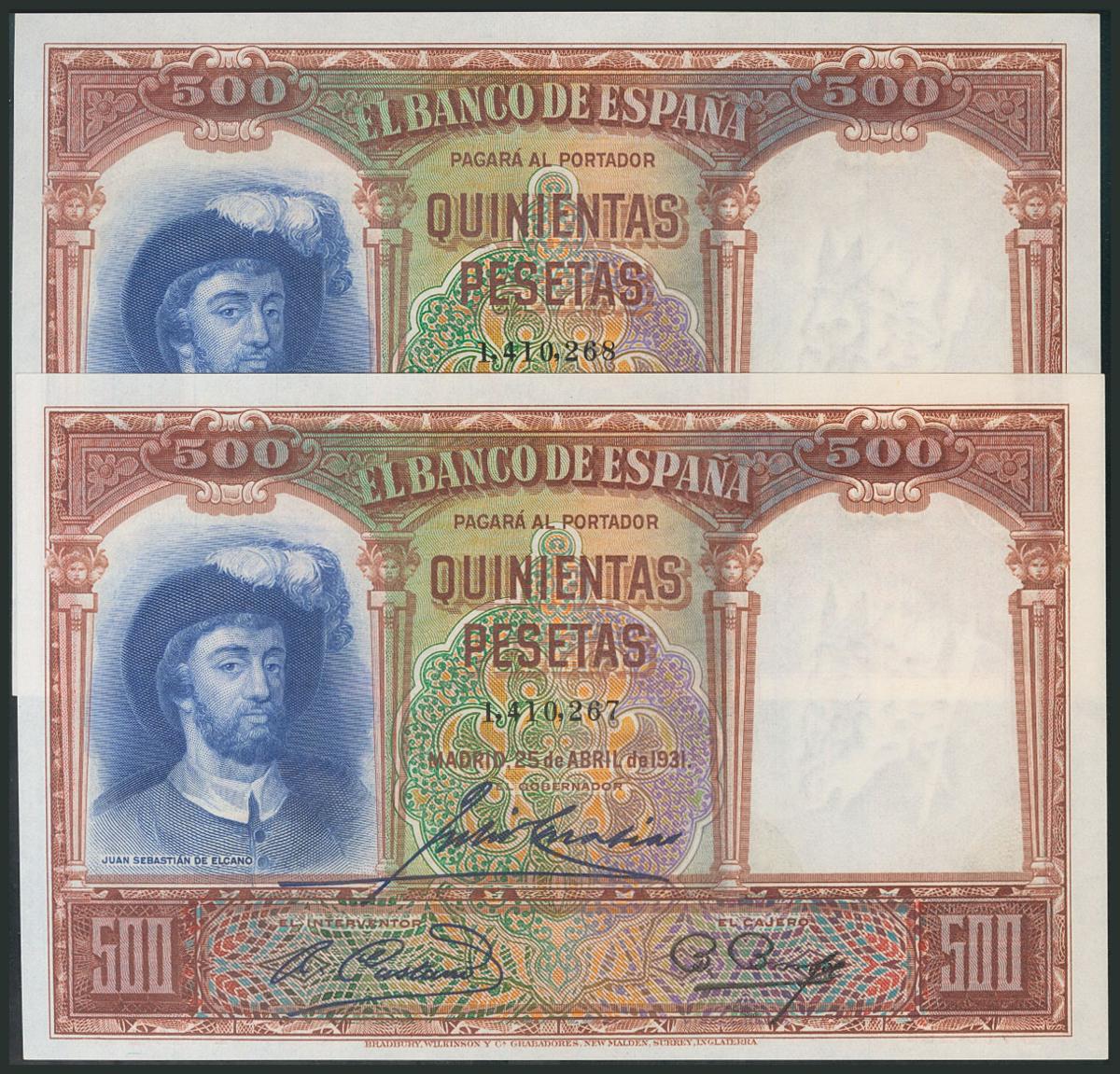 500 Pesetas. 25 de Abril de 1931. Pareja correlativa. Sin serie. (Edifil 2017: 361). Apresto original. EBC+.