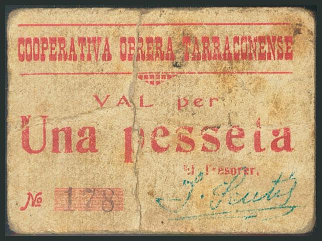 TARRAGONA. 1 Peseta. Cooperativa Obrera Tarragonense. (1938ca). (González: 10089). Muy raro. RC.