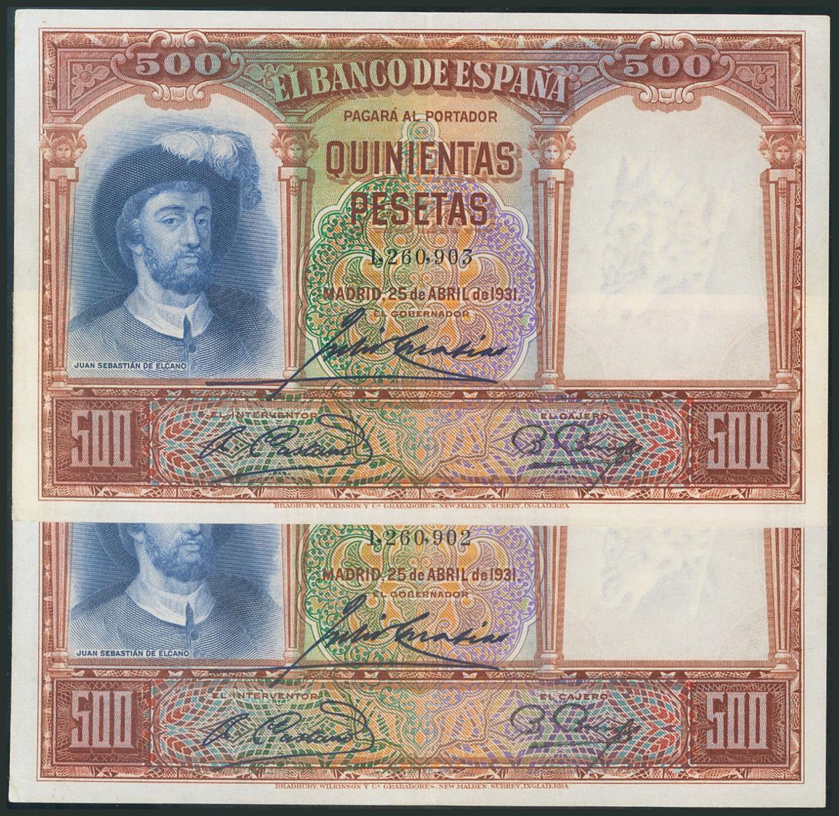500 Pesetas. 25 de Abril de 1931. Pareja correlativa. Sin serie. (Edifil 2017: 361). EBC-