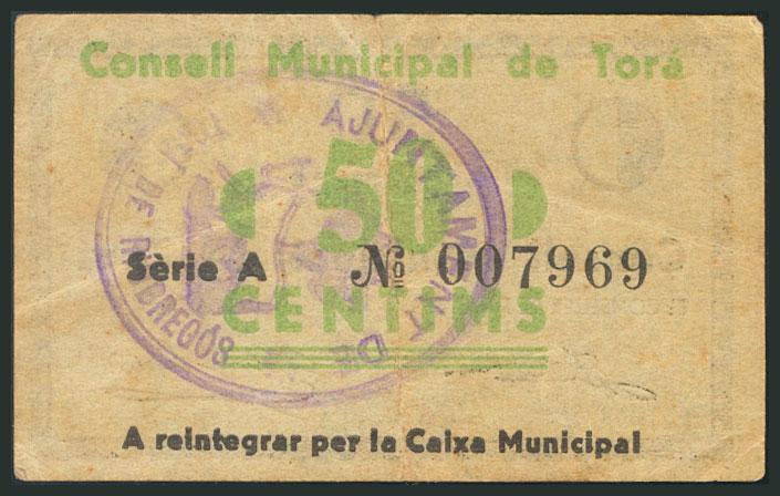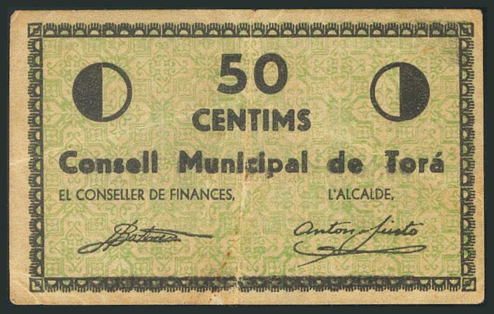 TORA DE RIUBREGOS (LERIDA). 50 Céntimos. (1938ca). (González: 10297). MBC+.