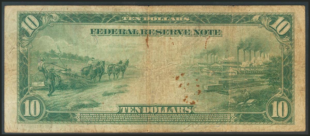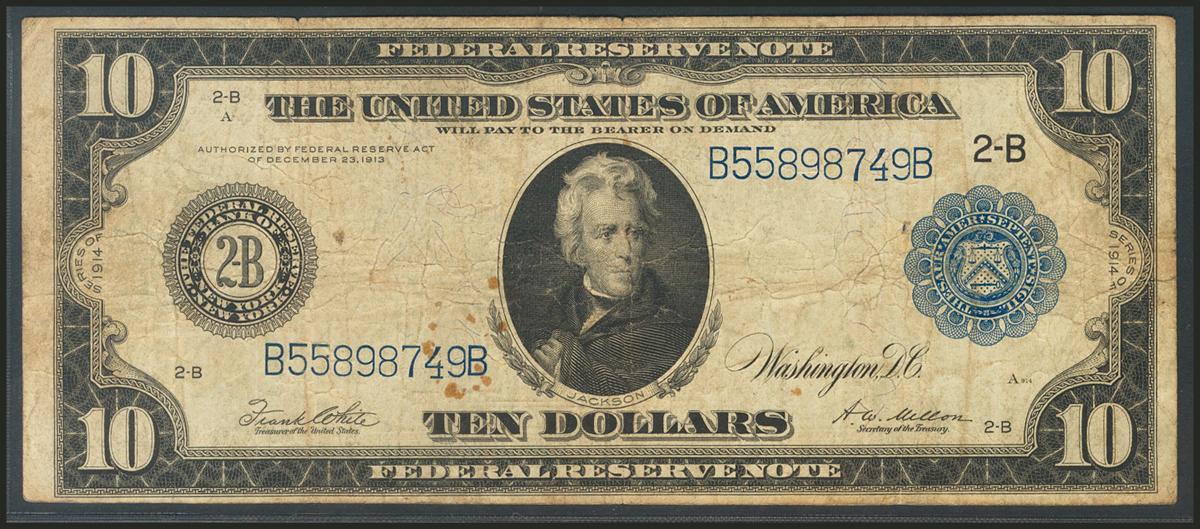 USA. 10 Dollars. Federal Reserve Note. New York. Serial number B-B. 1914. (Friedberg: 911A, Pick: 360B). Fine.