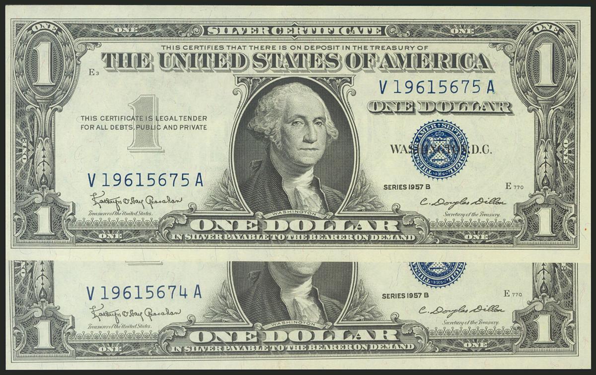 USA. 1 Dollar. Siver Certificate Note. Consecutive pair. Serial number V-A. 1957B. (Friedberg: 1621). About uncirculated.