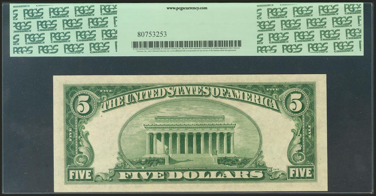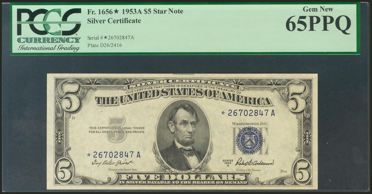 USA. 5 Dollars. Legal Tender Note. Serial number star*-A, replacement. 1953A. (Friedberg: 1656*, Pick: 381). PCGS65PPQ.