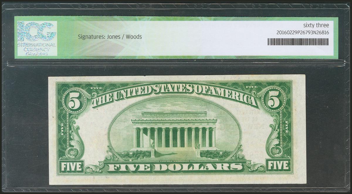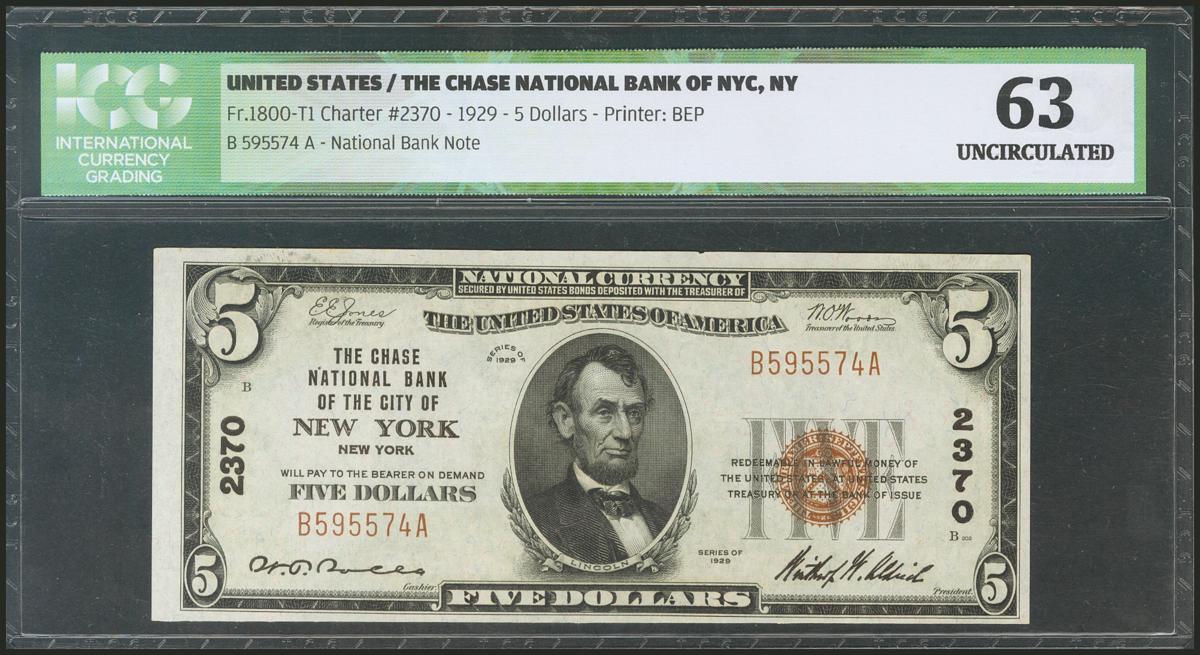 USA. 5 Dollars. National Currency. New York. Serial number B-A. 1929. (Friedberg: 1800-T1 Charter 2370). ICG63.