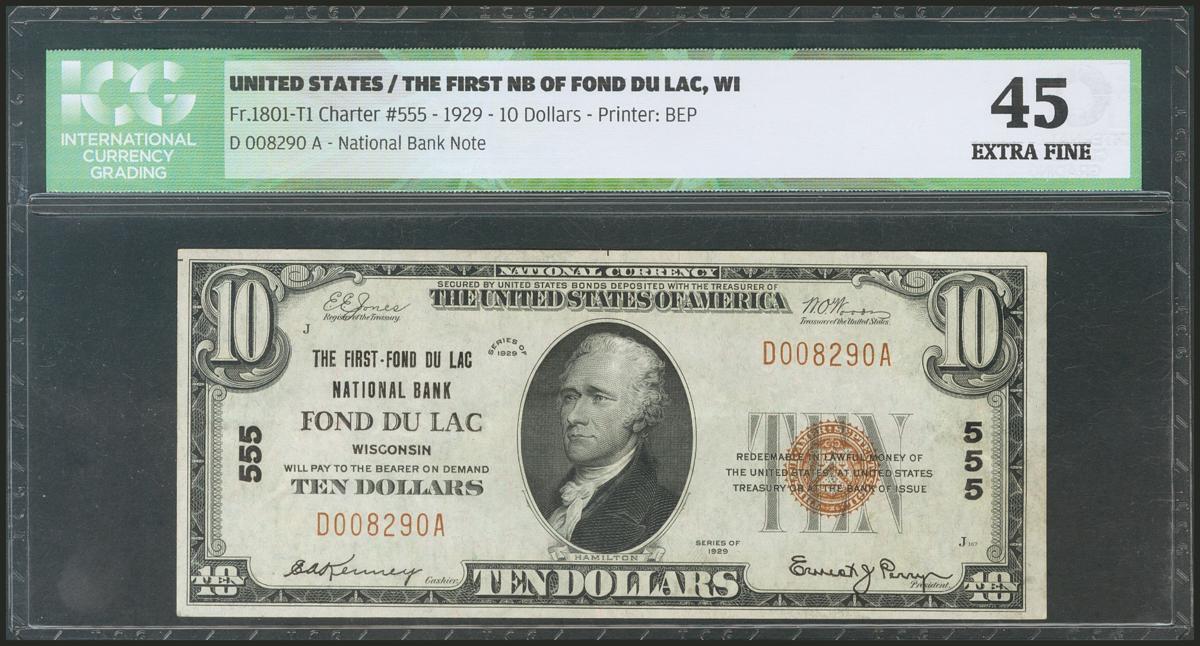 USA. 10 Dollars. National Currency. Wisconsin. Serial number D-A, low serial. 1929. (Friedberg: 1801-T1 Charter 555). ICG45.
