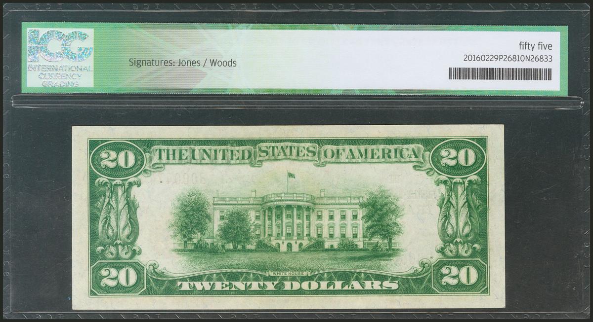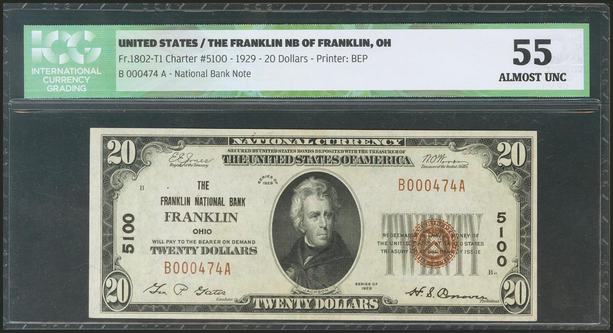 USA. 20 Dollars. National Currency. Ohio. Serial number B-A, low serial. 1929. (Friedberg: 1802-T1 Charter 5100). ICG55.