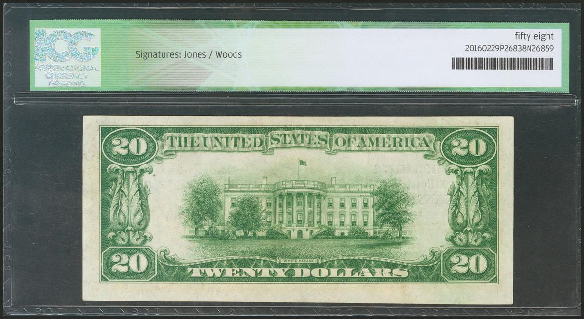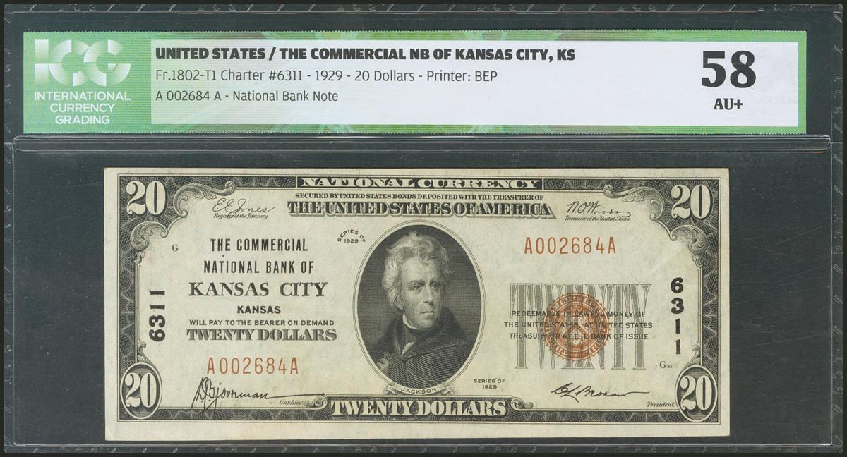 USA. 20 Dollars. National Currency. Kansas. Serial number A-A, low serial. 1929. (Friedberg: 1802-T1 Charter 6311). ICG58.
