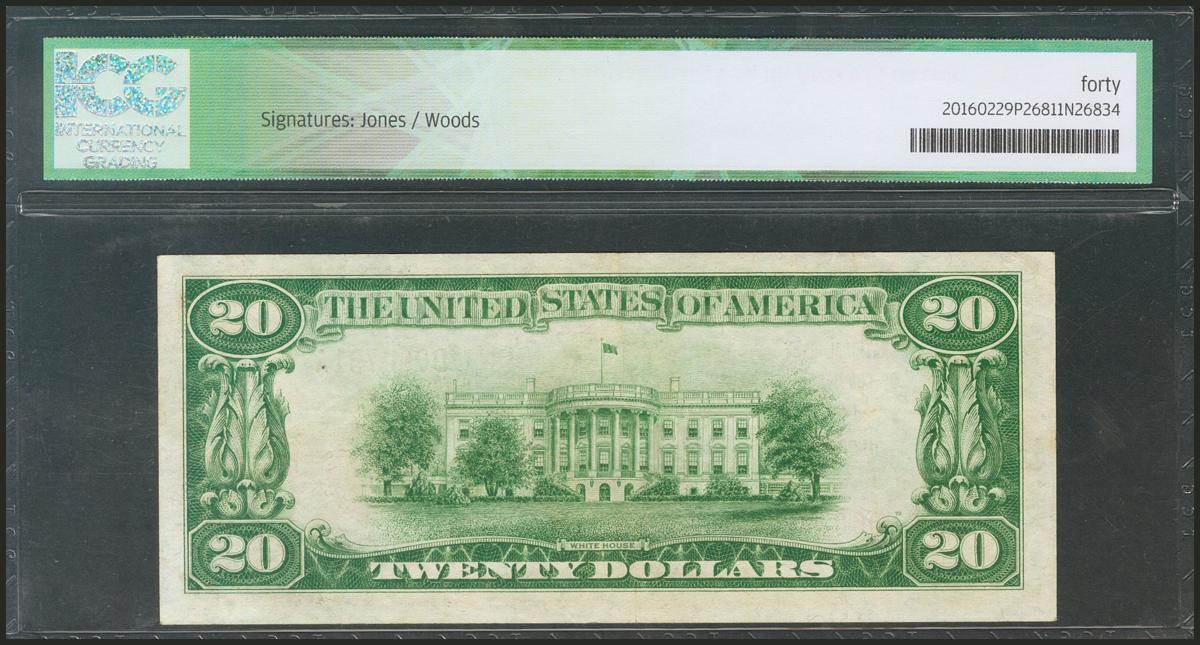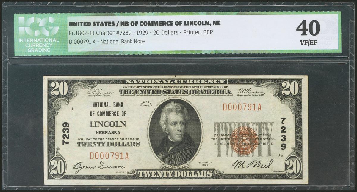 USA. 20 Dollars. National Currency. Nebraska. Serial number D-A, low serial. 1929. (Friedberg: 1802-T1 Charter 7239). ICG40.