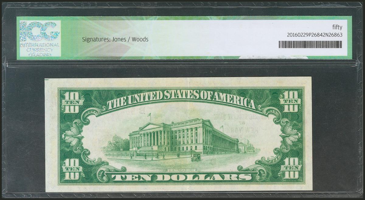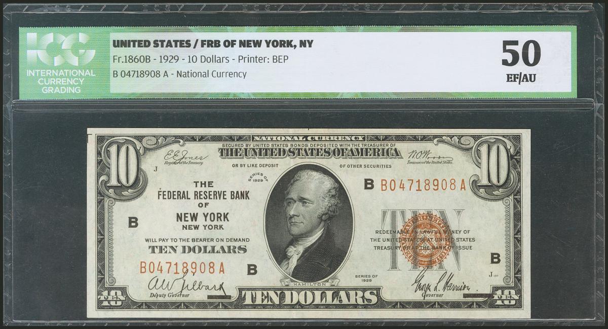 USA. 10 Dollars. National Currency. New York. Serial number B-A. 1929. (Friedberg: 1860B). ICG50.