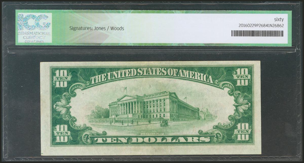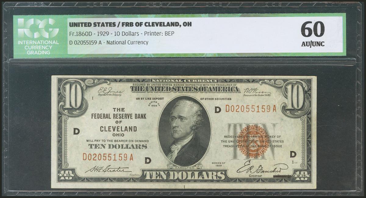 USA. 10 Dollars. National Currency. Cleveland. Serial number D-A. 1929. (Friedberg: 1860D). ICG60.